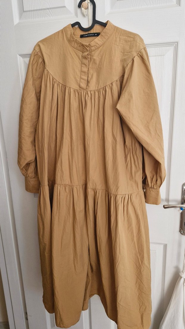Bej renkte, keten kumaştan uzun, bol kesim ve drapeli elbise. Uzun kollu, yuvarlak yakalı, desensiz bohem tarzda bir model.Yuzde yuz pamuklu 115 116 cm.