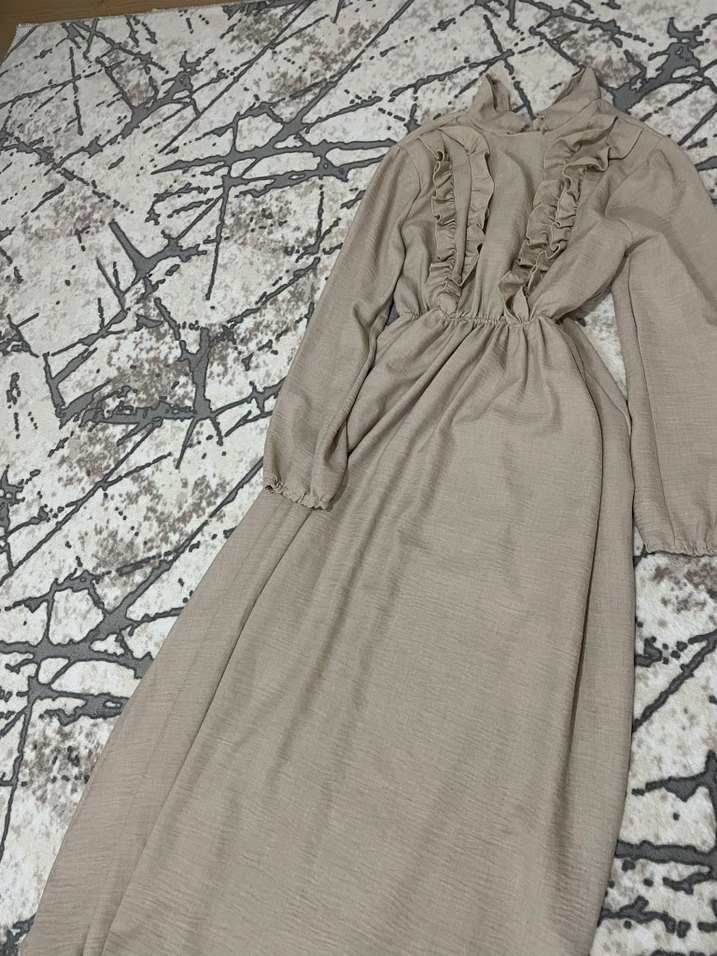 Bej keten elbise, yüksek yakalı ve uzun kollu, önünde fırfır detaylıdır. Bol kesim ve batik desenlidir, mütevazı bohem tarz sunar. Günlük kullanım için uygundur. krem renk S-M beden
