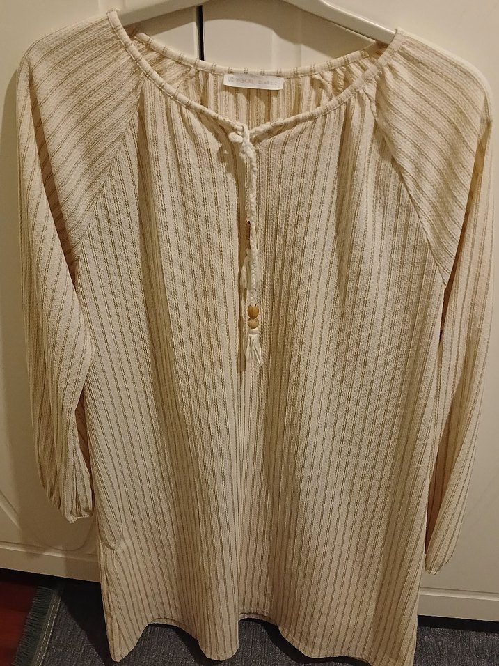 Bej renkli, keten kumaştan yapılmış, uzun kollu, düğmeli ve salaş kesim hamile bluzu. Günlük kullanıma uygun bohem tarzda rahat bir modeldir.