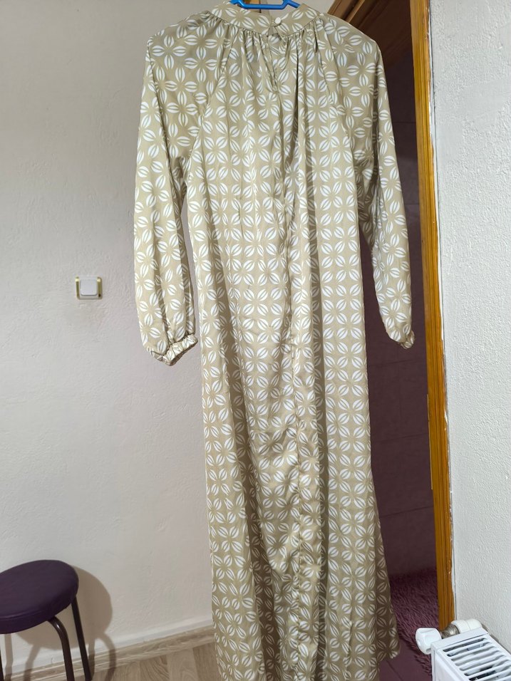 Bej renkte, uzun kollu , bol kesim uzun elbise. Yumuşak saten kumaştan, bohem tarzına uygun drapeli tasarım. ürün hasarsız ve rahat kullanımdadır.