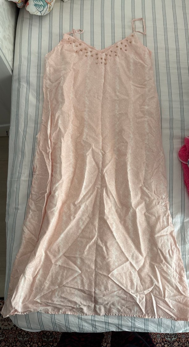 Pastel bej renkte, vintage bohem tarzında, uzun ve kolsuz bol kesim elbise. Kumaşı yumuşak dokulu ve desensizdir.