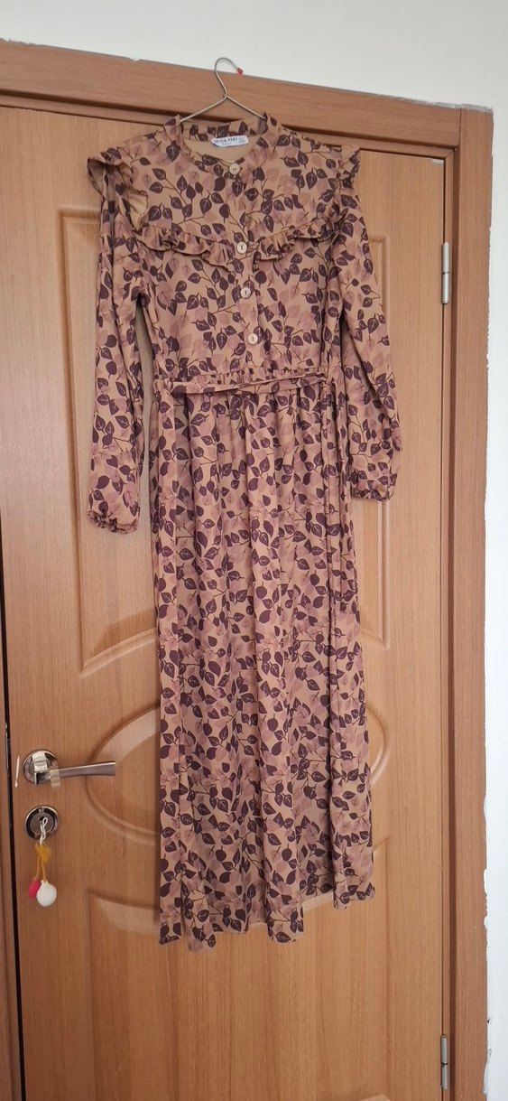 Bej renkte, bol kesim uzun elbise. Uzun kollu, yakalı, fırfırlı detaylar ve yaprak desenli bohem tarzda, yumuşak sentetik kumaştan.