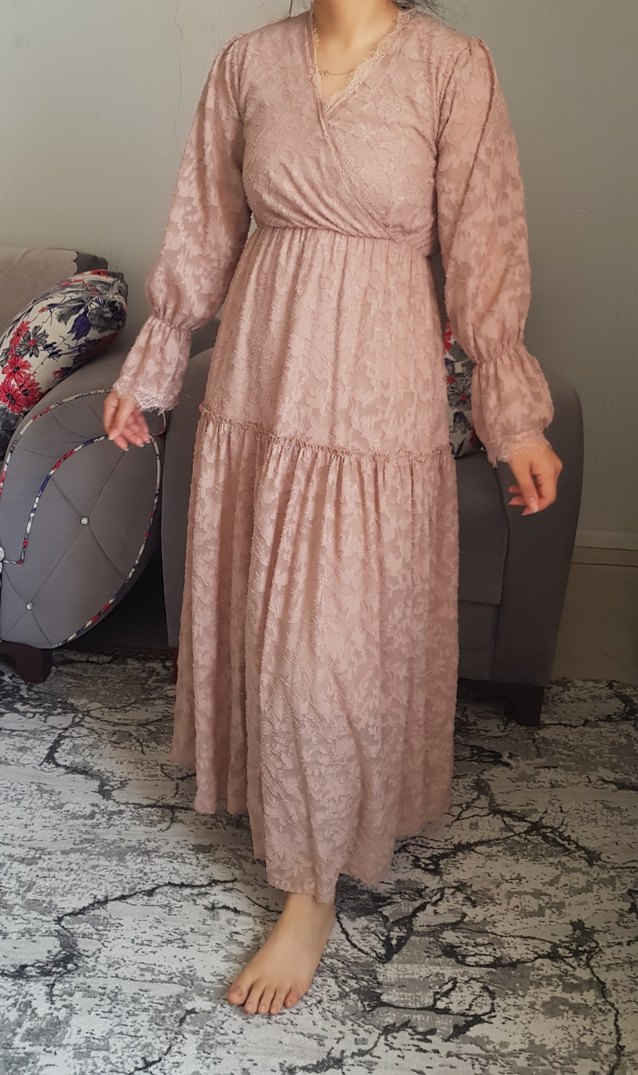 Bej renkte, bol kesim ve drapeli uzun kollu V yaka elbise. Yumuşak sentetik kumaştan, bohem tarzı için uygundur. beli lastikli 38,40,42 bedenlere olur sorunsuz