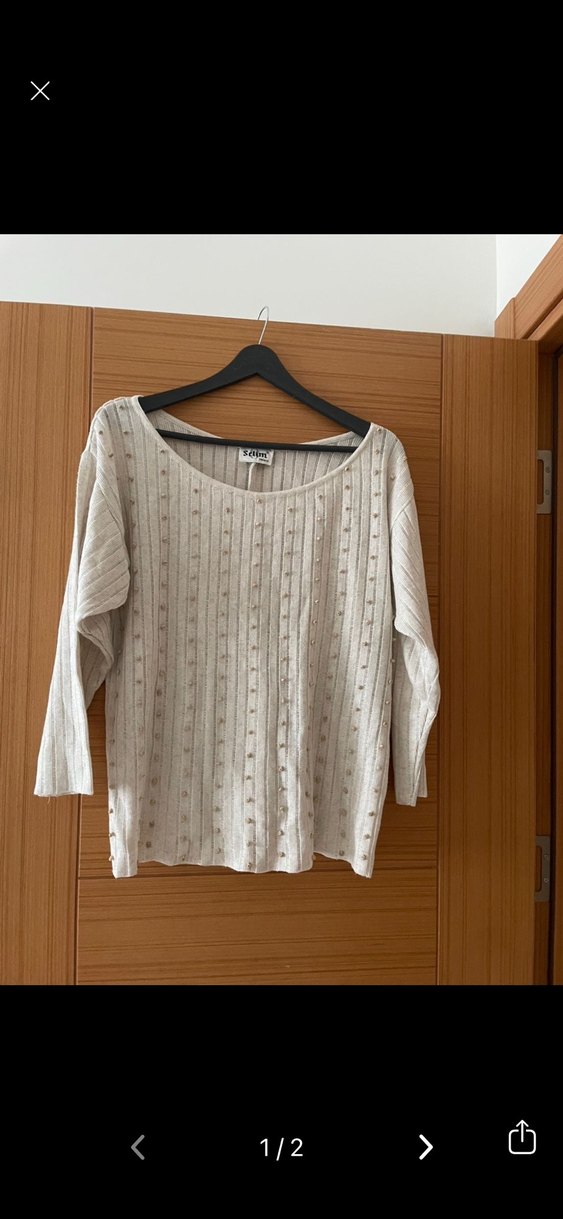 Bej renkli, uzun kollu ve kayık yaka olan bu örme keten kazak, rahat kesimi ve desensiz yapısıyla günlük kullanıma uygundur.