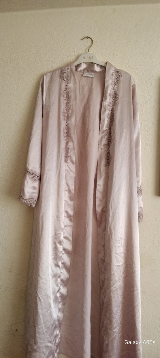 Uzun bej sabahlık, uzun kollu ve bol kesimdir. Kenarlarında ince dantel detayları bulunur, rahat ve bohem bir tarz sunar.