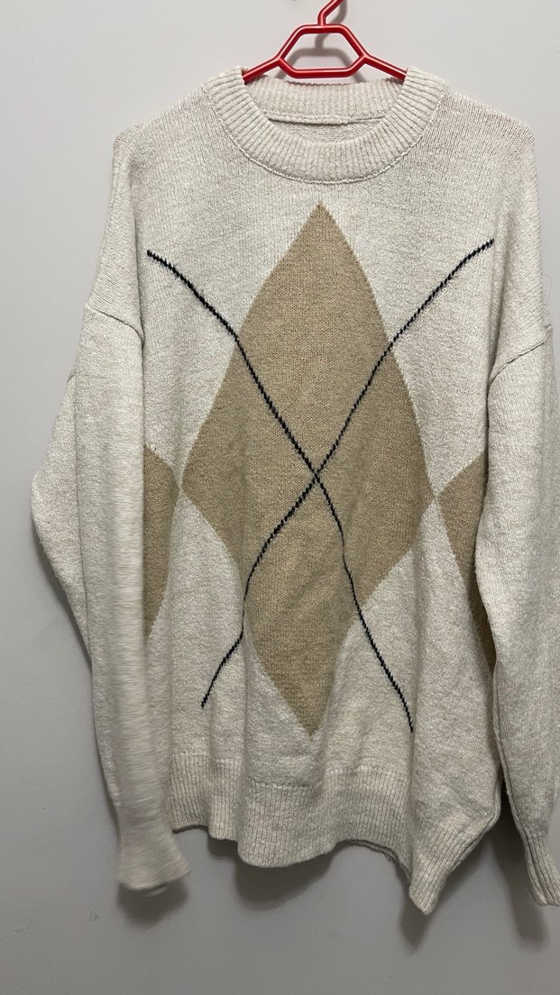 Bej renkte, bohem tarzda, büyük elmas desenli, uzun kollu ve yuvarlak yakalı rahat kesim triko kazak. Standart beden