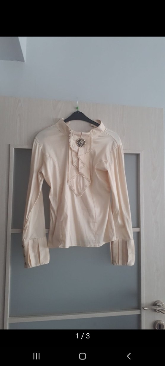 Bej renkli, keten kumaştan, uzun kollu ve yakalı, düğmeli vintage bohem tarzda, ofis kullanıma uygun bol kesim gömlek.