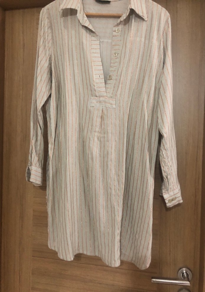 Bej keten kumaştan, uzun kollu, düğmeli ve V yaka bohem tarzda bol kesim kadın gömleği. Günlük kullanım için uygundur.