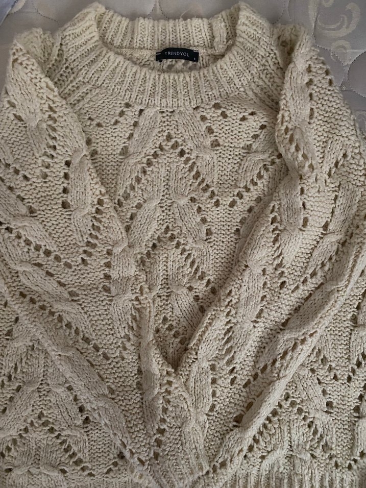 Bej renkli, yuvarlak yaka ve uzun kollu, bol kesim bohem tarz örgü kazak. Yumuşak dokuda, günlük kullanım için uygundur.