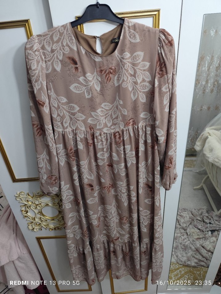 Bej renkli, salaş kesim uzun elbise, drapeli detaylar ve yuvarlak yaka ile. Uzun kollu ve hafif tie-dye desenlidir, bohem tarz için uygun.