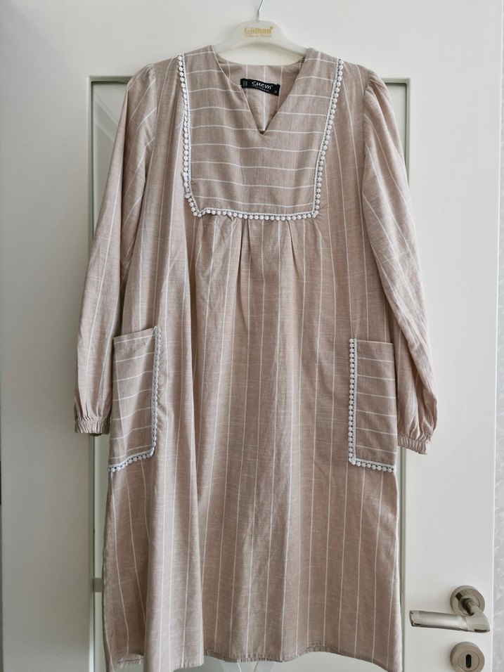 Bej renkli, uzun kollu, bol kesim ve tekne yaka tunik. Yumuşak pamuk keten kumaştan, ön cepli ve ince çizgili bohem tarzda günlük kullanıma uygun. Birkaç kez giyildi sorunsuz