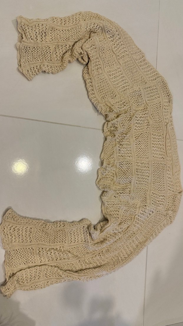 Bej renkte, örgü kumaştan yapılmış, uzun ve vücuda oturan, kayık yaka ve ince askılı kollara sahip bohem tarzda kadın kazak. Rahat kullanım için uygundur.