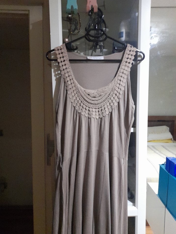 Bej renkli, örme kumaştan, kolsuz, bol kesim ve drapeli uzun elbise. Bohem tarzda, tek renk ve kayık yaka detaylıdır.