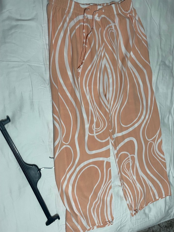 100cm boy 60-80 kg için uygun Bej renkli, uzun ve salaş kesim kadın pantolon, ipeksi kumaş ve drapeli tasarıma sahip, pastel tonlarda batik desenli, bohem tarzda dış mekan kullanımı için uygun.