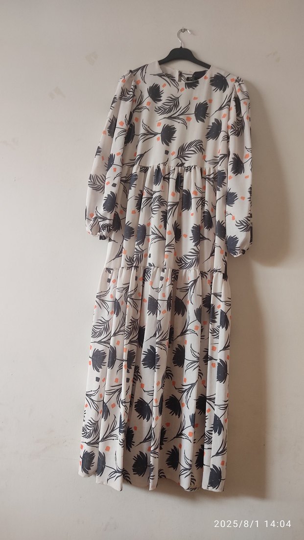 Bej renkte, bol kesim ve pile detaylı uzun elbise. Uzun kollu ve yuvarlak yakalı, gri tonlarında hafif batik desenli, günlük kullanıma uygun.
