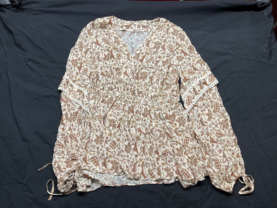 Bej renkli, uzun kollu, V yakalı, dantel detaylı ve desenli bohem tarzı kadın bluz, rahat kesimle günlük kullanıma uygundur.