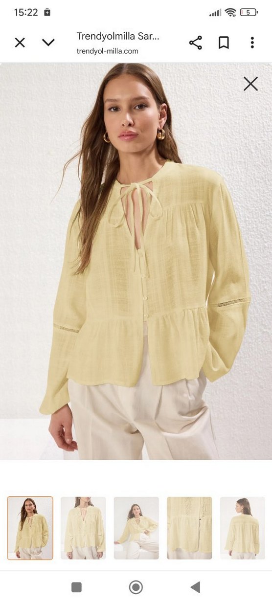 Bej keten kumaştan, bol kesim, uzun kollu ve önde bağcıklı V yaka gömlek. Düğme detaylı, kısa boy, ofis için uygun bohem tarzda.