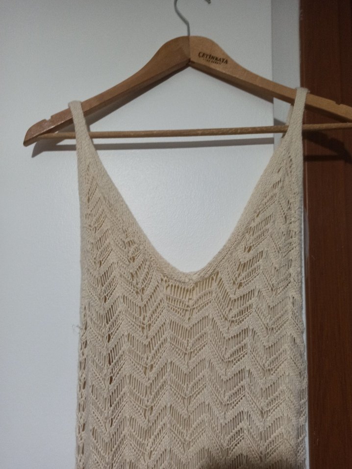 Bej renkli, V yakalı ve kolsuz, vücuda oturan örgü uzun elbise. Bohem tarzda, günlük kullanıma uygun, yumuşak dokulu.