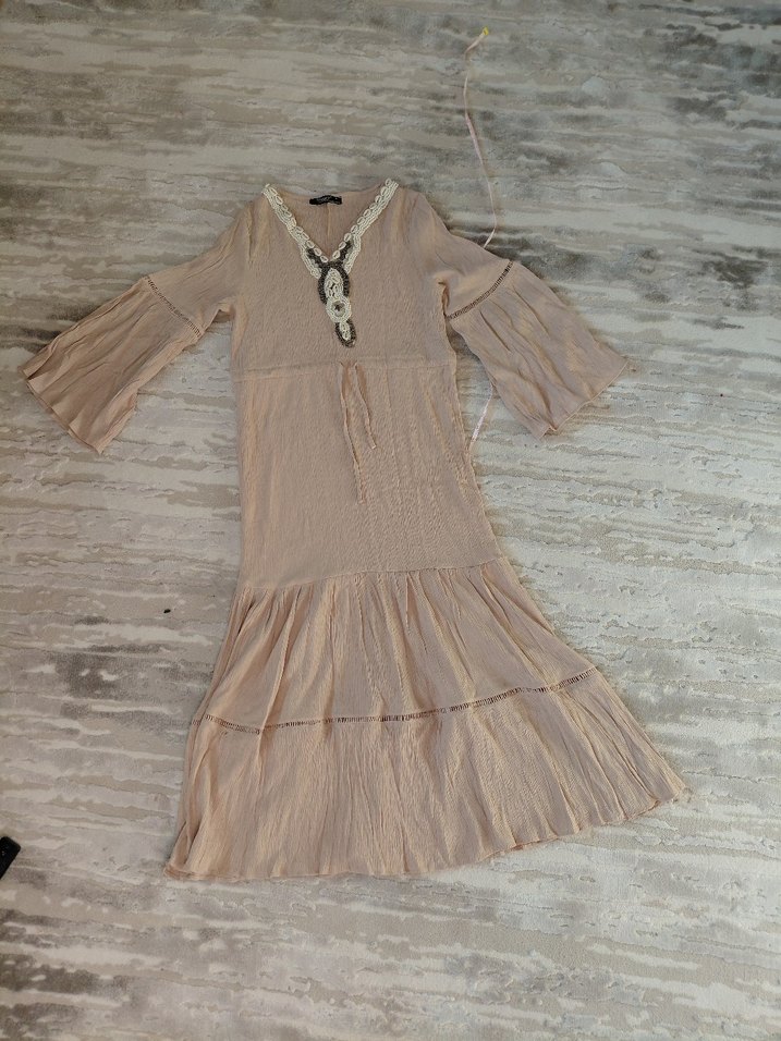 Bej renkte, uzun keten elbise, bol kesim ve uzun kollu. V yaka kısmında boncuk detayı bulunur. Pastel tonlarda, desen içermeyen bohem tarzda günlük kullanıma uygundur,boy 125 cm,bel ve iki kol arasi 43 cm,kol boyu 50 cm ,burumcuk kumas