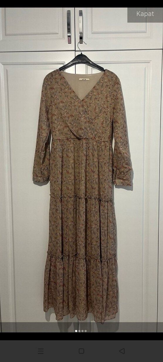Bej renkte, V yakalı, uzun kollu ve bol kesimli bohem tarzda uzun elbise. Hafif tie-dye desenli, dökümlü kumaştan yapılmıştır. içi astarlıdır 165 170 boya uygundur gardrop hesabından aldım fakat bana boyu uzun geldi