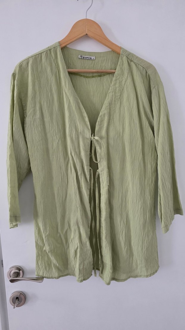 Bol kesim, yarım kollu mint yeşili kadın gömlek. Minimalist bohem tarzda, desensiz ve yumuşak dokulu.