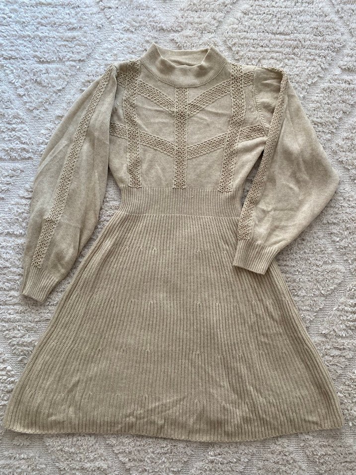 Trenyol kışlık triko elbise Giyince ön kısmı arkasına göre biraz daha uzun duruyor. Bej renkte, yüksek yakalı ve uzun kollu kadın triko elbise. Yumuşak örgü kumaştan, bele oturan ve bohem tarzda, günlük kullanım için uygun.