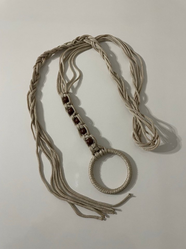 Bej renkli, zincir detaylı ve uzun kemer, bohem tarzı için uygundur.