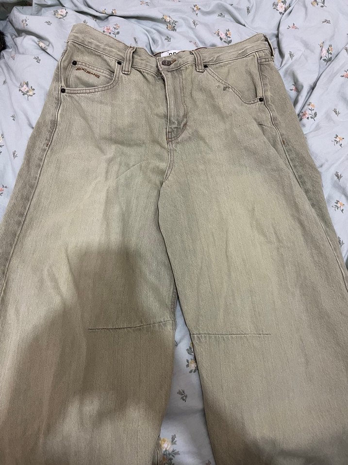 Bej renkli, bol kesim, midi boy kadın denim pantolon. Günlük kullanıma uygun rahat ve şık bir sokak stili sunar.