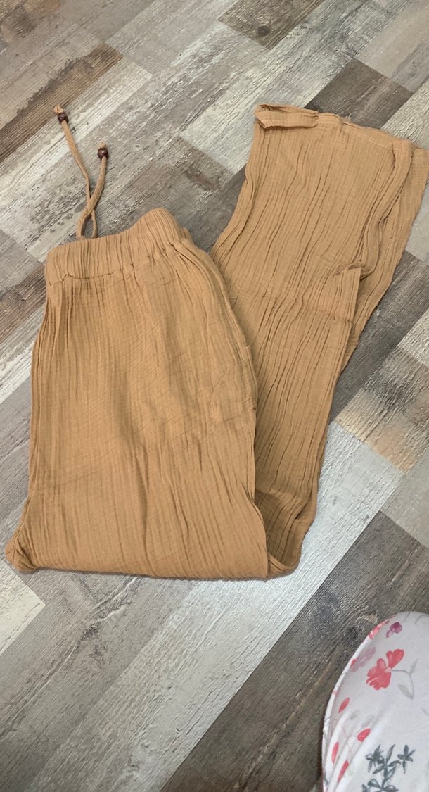 Bej renkte, bol kesim ve pileli detaylara sahip kadın keten pantolon. Bohem tarzı, uzun ve desensiz tasarımıyla rahat bir kullanım sunar.