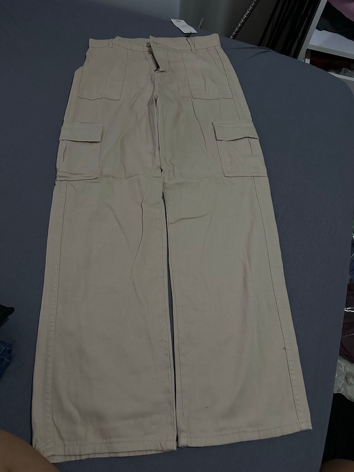 Bej renkte, kemerli ve cepli bol kesim pantolon. Sentetik kumaştan üretilmiş, günlük kullanıma uygun rahat bir model.