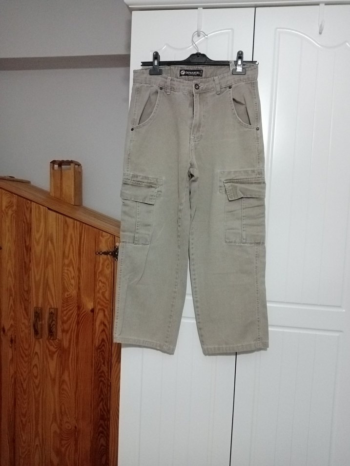 kemerli, çok cepli, bol kesim bej kot pantolon, rahat sokak stili için uygundur.