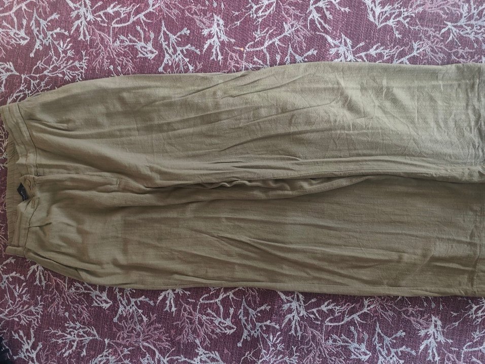 Bej renkli, keten kumaştan bol kesim ve drapeli tasarıma sahip rahat pantolon, bohem tarzı yansıtır.