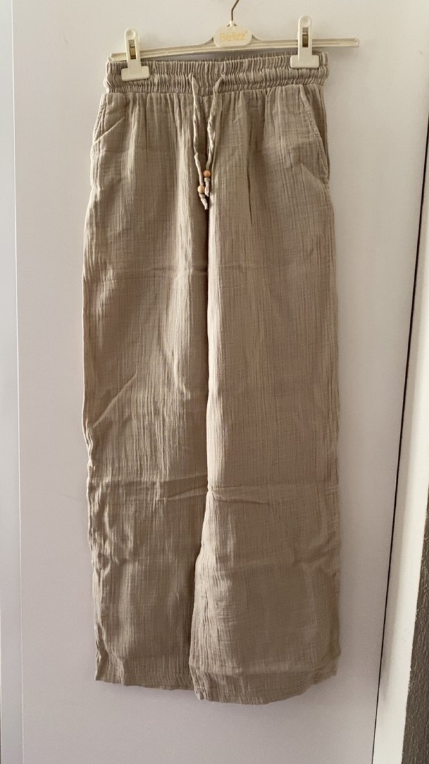 Bej renkli keten kumaştan, bol kesim ve uzun boylu, günlük kullanıma uygun rahat ve şık pantolon.
