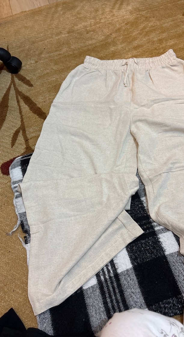 Bej renkli, bol kesim keten pantolon, midi boyda, rahat ve zahmetsiz bohem tarzıyla günlük kullanıma uygundur.