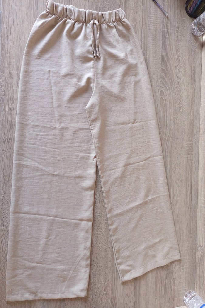 Bej renkli keten kumaştan, bol kesim ve uzun boylu kadın pantolonu. Rahat ve bohem tarzda, gündelik kullanıma uygun. S/m beden