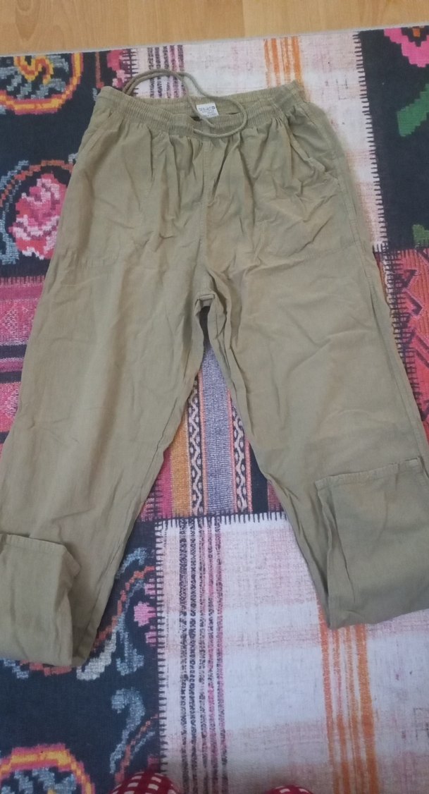 Bej renkli, bol kesim keten kumaştan uzun kadın pantolonu. Bohem tarzıyla günlük kullanıma uygun, rahat ve şık bir model.