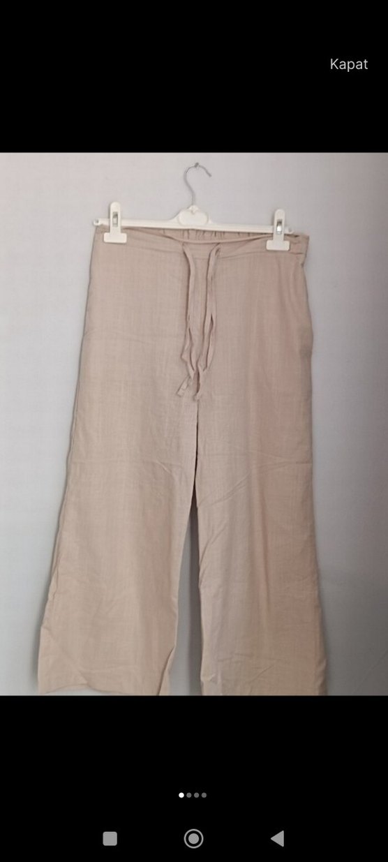 Bej renkli, bol kesim ve keten kapri, minimalist bohem tarzıyla günlük kullanıma uygundur.