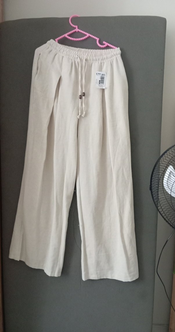 Bej renkli, bol kesim keten kumaştan midi boy kadın pantolon. Rahat bağcıklı beliyle günlük, bohem tarzda şık bir görünüm sunar.
