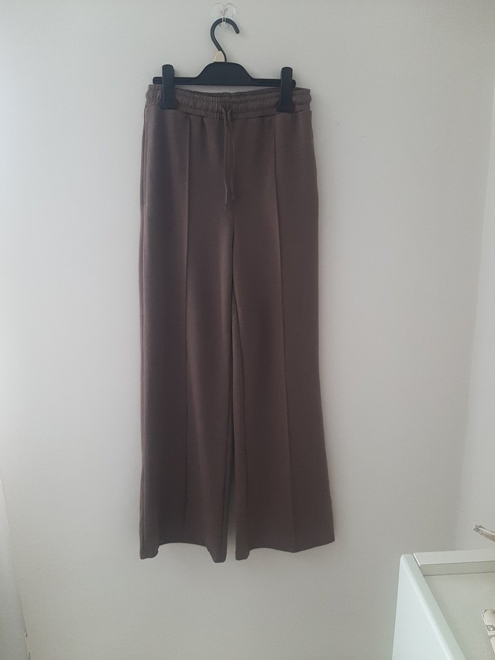 Bej renkli, bol kesim midi uzunlukta, kemerli kumaş pantolon. Günlük kullanım için yumuşak sentetik kumaştan üretilmiştir. Trendy rahat stil için uygundur.