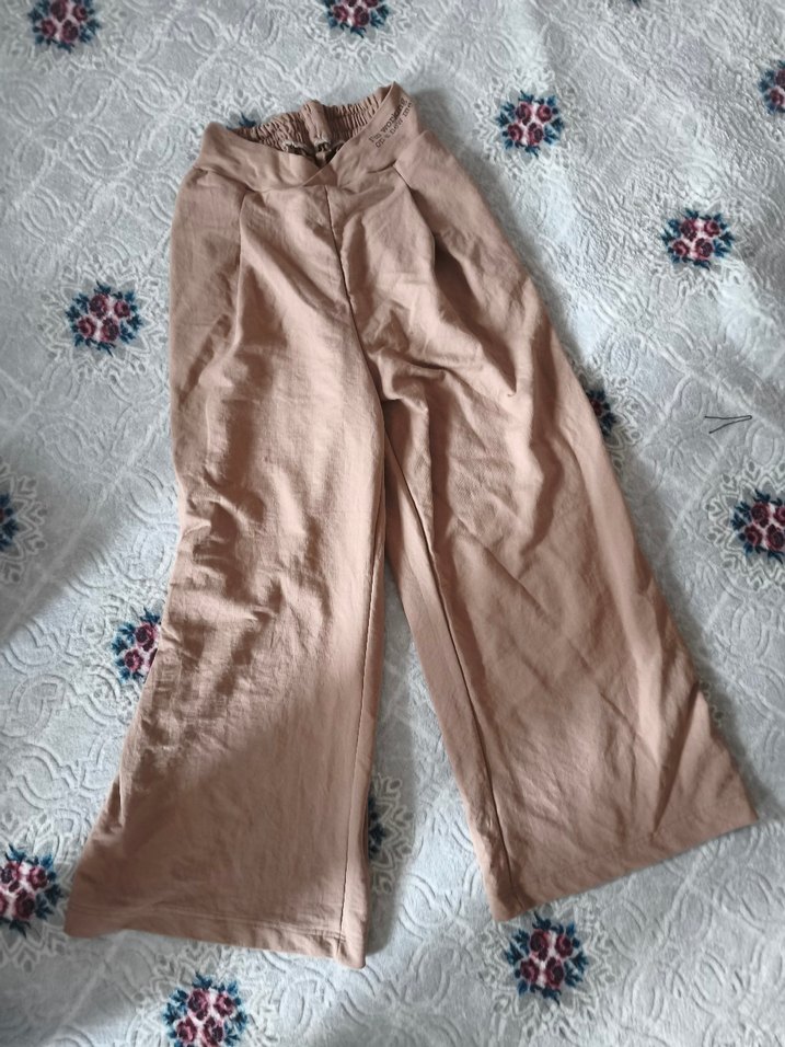 Bol kesim, bej pantolon, pile detaylı, midi boy ve yumuşak rahat kumaş ile günlük kullanım için uygundur.