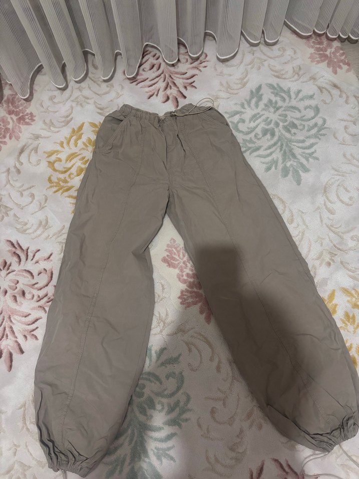 Bol kesim bej toprak renkli paraşüt pantolon, ve bilekleri lastikli. Dış mekan sokak stili için uygun, desensiz ve rahat bir model.