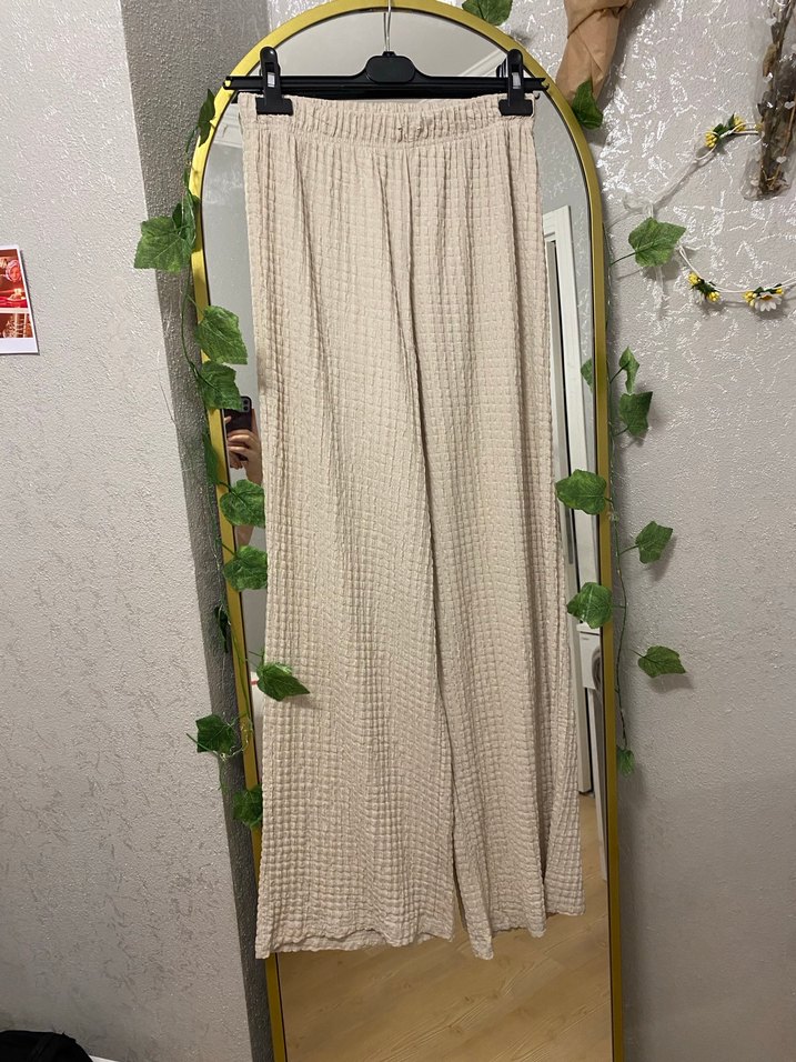 Bol kesim bej pantolon, pliseli detaylı ve bohem tarzda. Hafif ve rahat yapısıyla günlük kullanıma uygun.