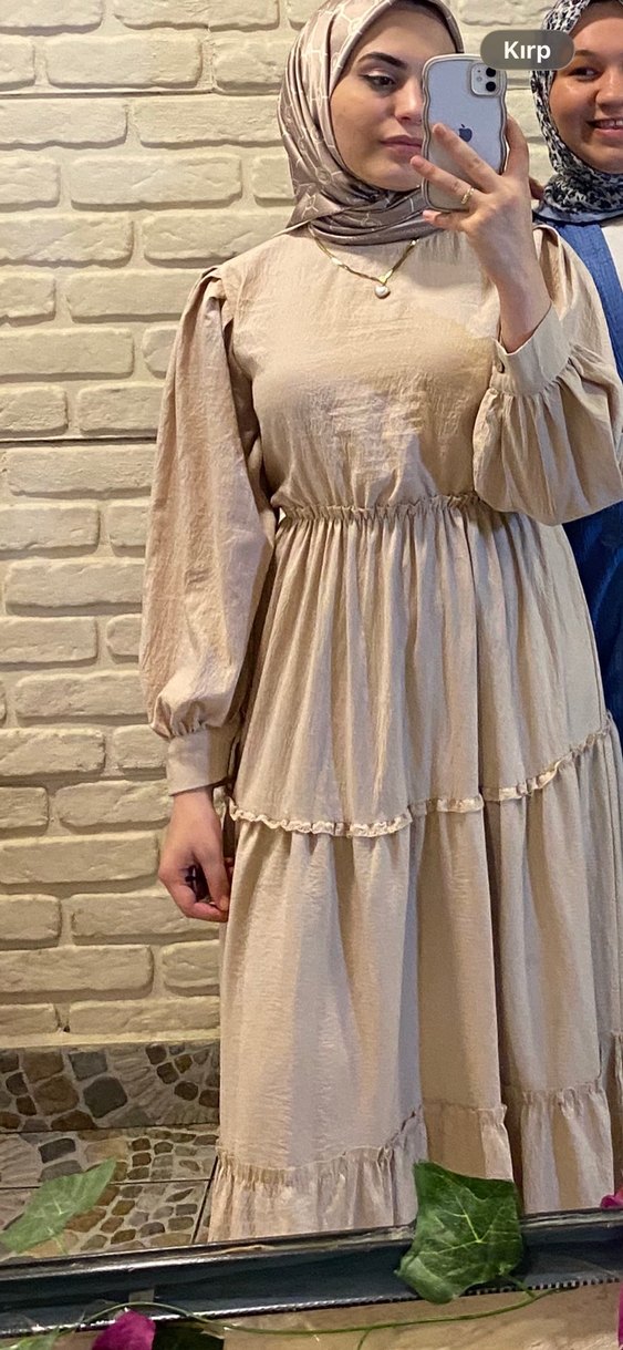 Bej renkli uzun keten elbise, yüksek yakalı ve fırfırlı detaylara sahiptir. Bol kesimi ve uzun kollarıyla gündelik kullanıma uygundur.