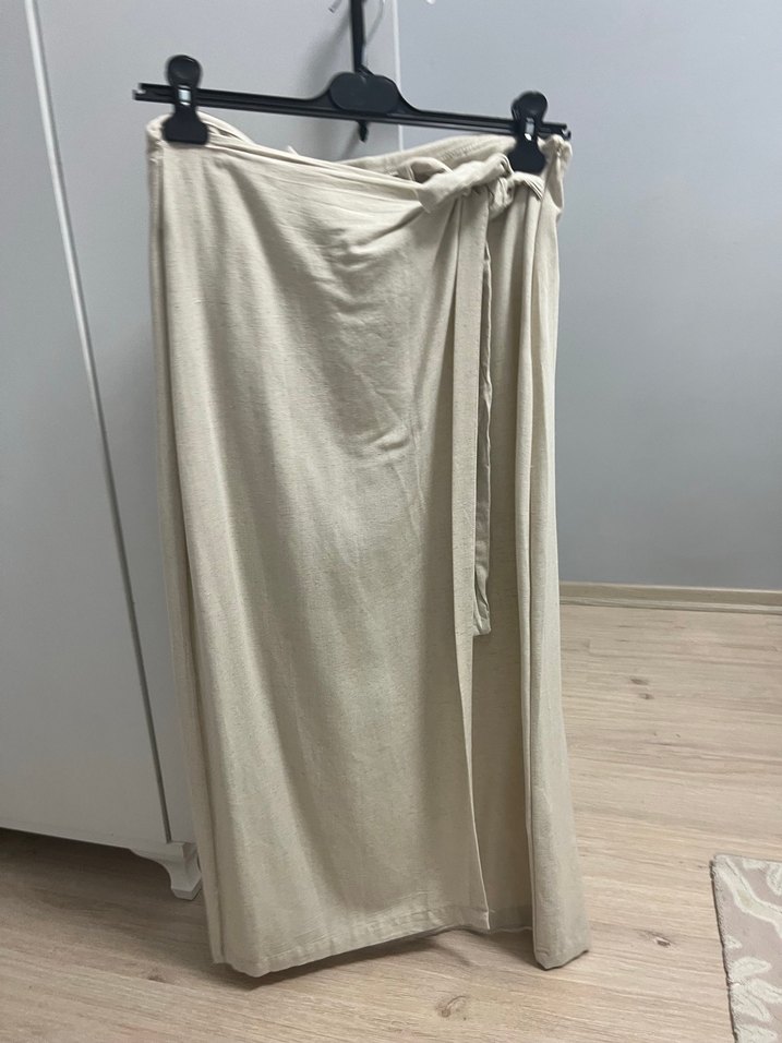 Bej renkli, bol kesim ve keten kumaştan yapılmış uzun etek, minimalist bohem tarzı için uygundur.