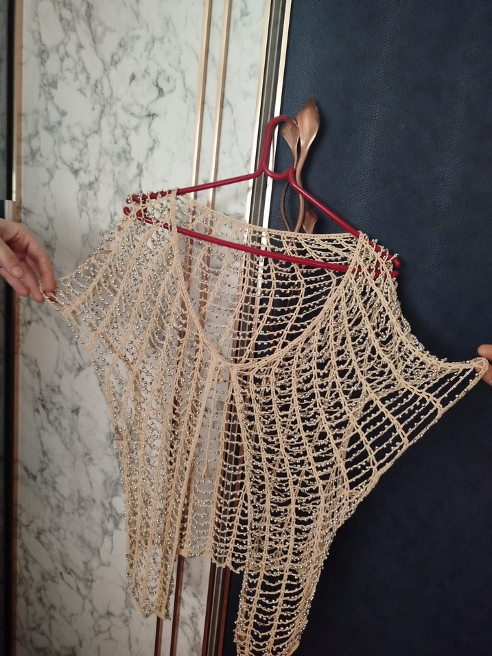Hafif bej renkli, dantel detaylı kadın örgü yelek, bohem tarzda avant-garde moda tutkunları için.