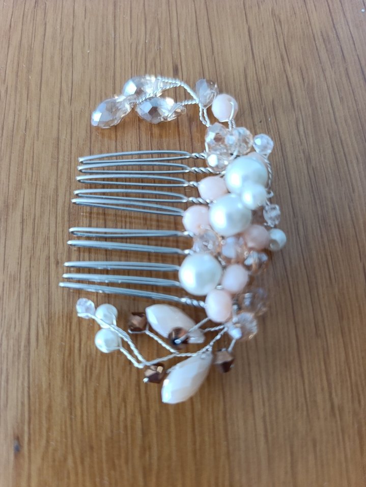 Bej renkli, boncuk ve incilerle süslenmiş örme saç tokası. Bohem ve vintage tarzı yansıtır. Nişan ve özel gunlerde kullanılabilir. 1 defa kullanıldı. Minimalistik şıklık sevenler için.