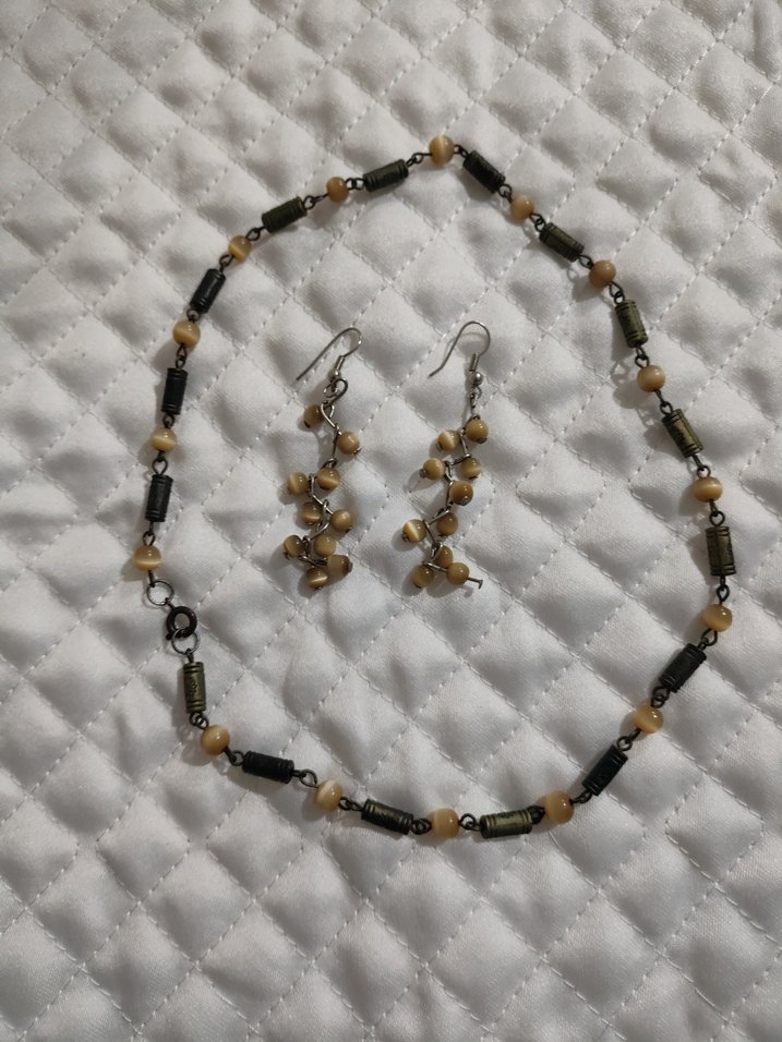 Bej boncuklarla süslenmiş kısa uzunlukta bohem kolye ve uyumlu küpe seti. Minimalist ve retro tarzda, günlük kullanıma uygun.