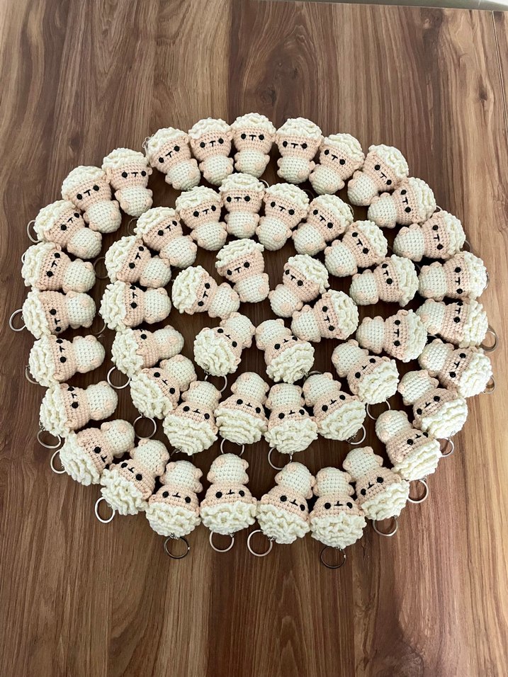 Hafif bej renkte, boncuklu ve bohem tarzda kuzu anahtarlık, sade görünüm için uygundur.