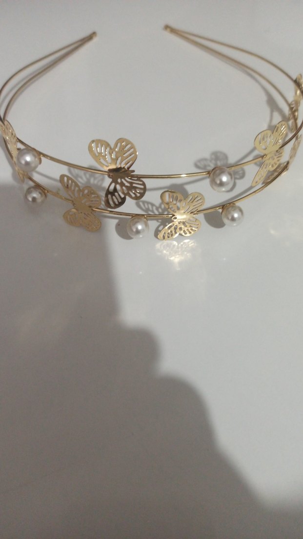 Bej renkli metalden yapılmış, boncuk ve kelebek detaylı bohem tarzda saç aksesuarı. Retro ve hippie stiller için uygundur.