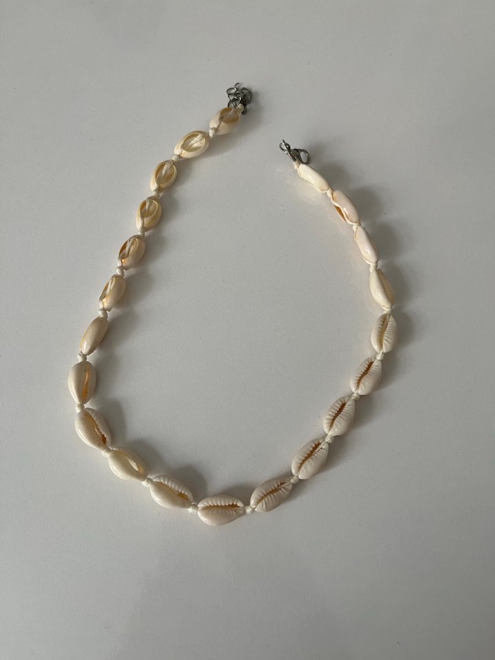 Bej renkli, doğal deniz kabuğu boncuklardan oluşan bohem tarzda, midi uzunlukta sade kadın kolye. Günlük kullanım için uygun.